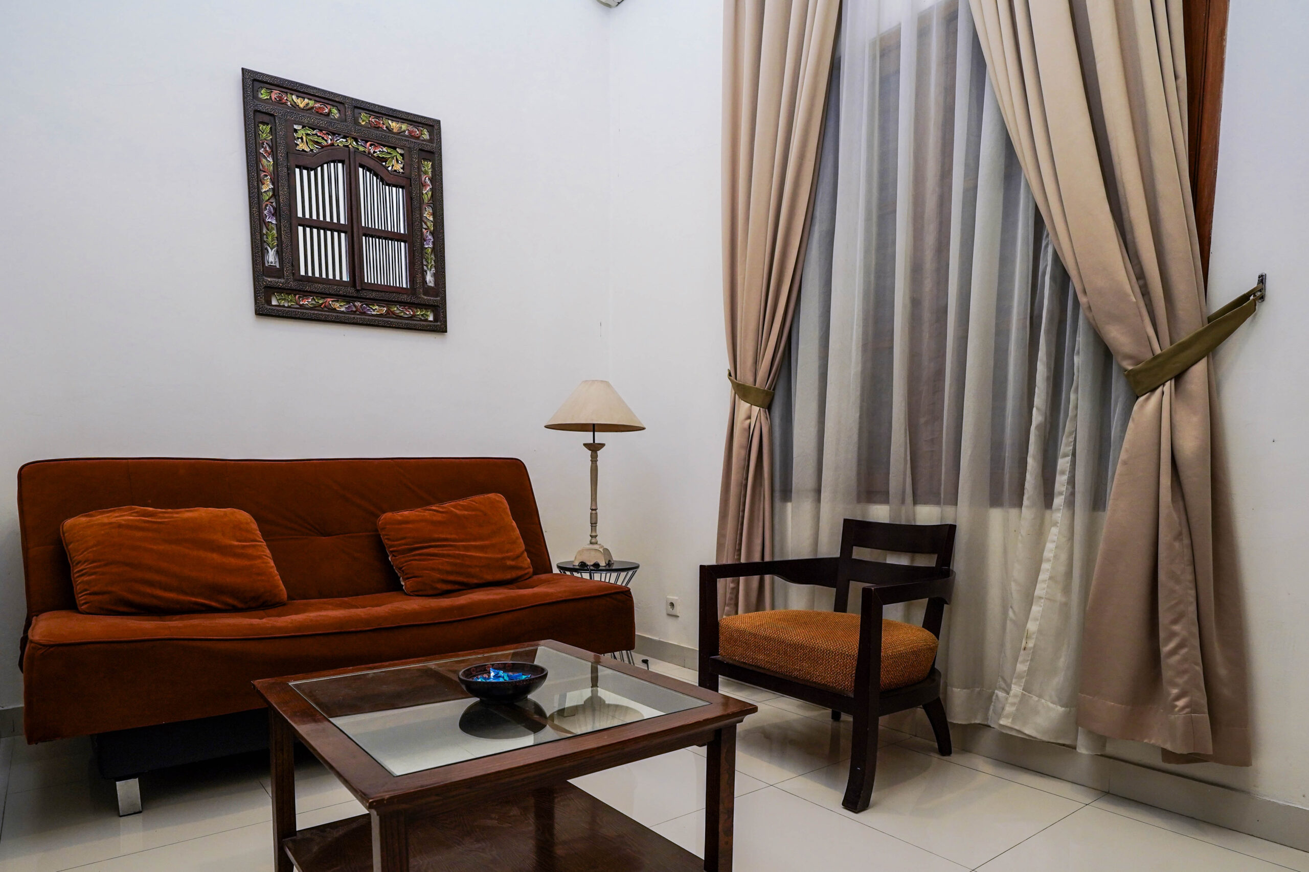 Kamar dengan kelengkapan fasilitas berupa tempat tidur Queen size, AC, kamar mandi dengan shower air panas dan air dingin, TV, lemari pakaian dan sofa.